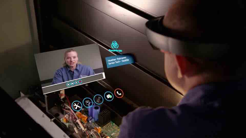 目前最常用的AR設(shè)備就是微軟開發(fā)的HoloLens眼鏡,用戶只需戴在頭上,通過(guò)眼鏡的投射設(shè)備就能在現(xiàn)實(shí)場(chǎng)景中看到立體虛擬對(duì)象。HoloLens眼鏡和很多智能設(shè)備一樣提供相應(yīng)的語(yǔ)音和視頻即時(shí)通訊,但是還能夠通過(guò)復(fù)雜的計(jì)算機(jī)算法實(shí)現(xiàn)將現(xiàn)場(chǎng)場(chǎng)景虛擬化,生成與具體場(chǎng)景相似的三維虛擬場(chǎng)景。在遠(yuǎn)程的專家能夠通過(guò)這種快速生成的虛擬場(chǎng)景了解現(xiàn)場(chǎng)的基本情況。另外遠(yuǎn)程專家還可以在虛擬場(chǎng)景中畫出三維指導(dǎo)標(biāo)示,并與現(xiàn)場(chǎng)的實(shí)景進(jìn)行重疊,通過(guò)直觀具體的引導(dǎo)方式讓協(xié)助更加精確。在現(xiàn)場(chǎng)的作業(yè)人員通過(guò)眼鏡同樣可以看到指示標(biāo)示出現(xiàn)在眼前,根據(jù)指示進(jìn)行相應(yīng)操作。另外通過(guò)三維模型與空間技術(shù)的相結(jié)合,作業(yè)方所看到的指示也是立體呈現(xiàn)的,并與現(xiàn)實(shí)的空間位置相關(guān)聯(lián),盡管作業(yè)方隨意走動(dòng)也不會(huì)影響到立體指示空間位置。