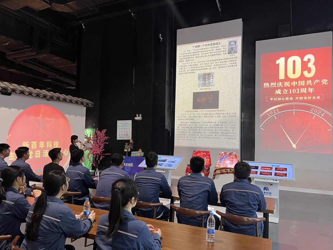 宣誓結(jié)束后,大家移步至活動(dòng)中心的多功能廳,觀看了《廣西這百年》紅色文化視頻。視頻通過豐富的歷史影像和生動(dòng)的敘述,展示了廣西在中國(guó)共產(chǎn)黨領(lǐng)導(dǎo)下的百年巨變。從革命斗爭(zhēng)的艱苦歲月,到改革開放的蓬勃發(fā)展,再到新時(shí)代的輝煌成就,每一幀畫面都深深觸動(dòng)了在場(chǎng)的每一位員工。