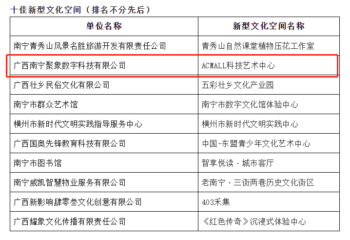 以下是南寧市十佳新型文化空間名單: